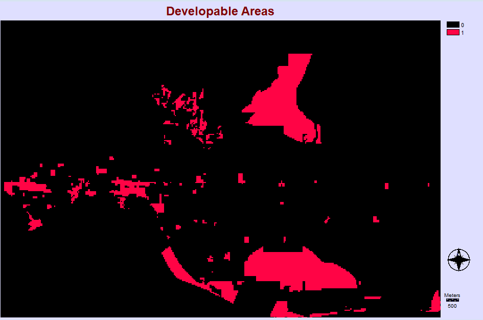 Reclass was used to reclassify my land use zones for both developable and non-developable areas. I first created areas that could absolutely not be developed on (water, parks, conservation areas, etc.) so I had a clear idea of where these areas were.